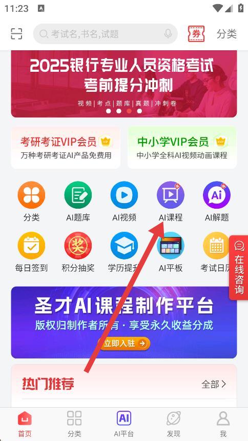 1、打開(kāi)圣才電子書(shū)App,在首頁(yè)點(diǎn)擊AI課程圖標(biāo)。