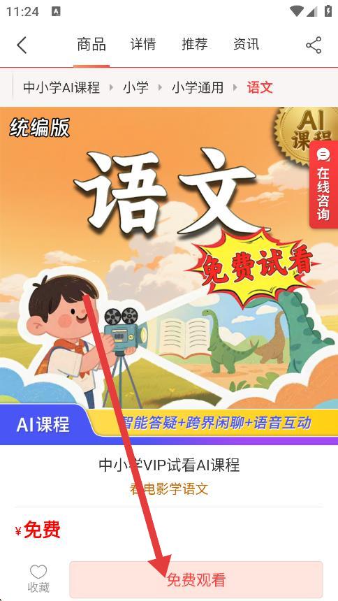 3、在課程商品詳情頁(yè)面,點(diǎn)擊下方的免費(fèi)觀看按鈕。