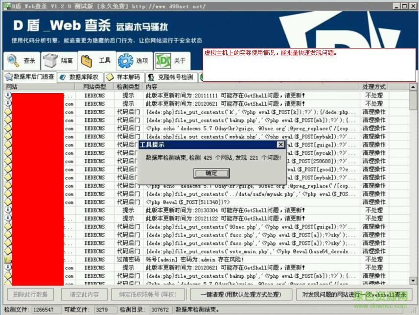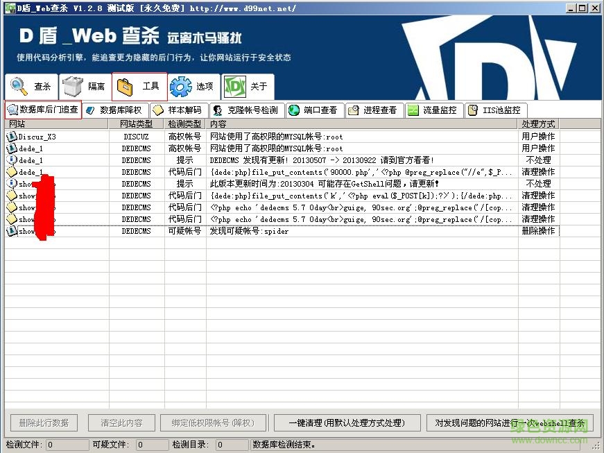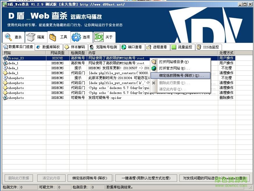 特別針對(duì) DEDECMS 數(shù)據(jù)庫(kù)里的后門(mén)數(shù)據(jù)進(jìn)行檢測(cè),并對(duì)使用高權(quán)限數(shù)據(jù)庫(kù)帳號(hào)(如:mysql的root帳號(hào))進(jìn)行提示,并支持降權(quán)操作,防范因網(wǎng)站使用高權(quán)限的數(shù)據(jù)庫(kù)帳號(hào)導(dǎo)致服務(wù)給入侵!