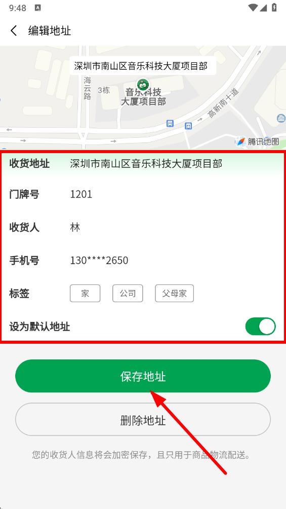 4、在編輯地址頁面,修改收貨地址、門牌號、收貨人、手機(jī)號等信息,確認(rèn)無誤后點(diǎn)擊保存地址按鈕,即可完成收貨地址的修改。
