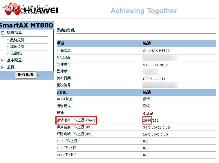 進(jìn)入“貓”以后的頁面,在狀態(tài)信息里的系統(tǒng)信息中可以查看到自己的帶寬,帶寬是激活速率這一欄,如圖二。下行1024為1m,2048為2m,依次類推。看看你家是不是和你申請的帶寬相符,不符的話就打10000吧。