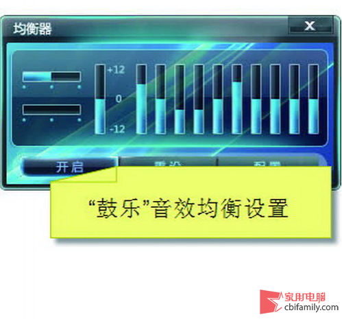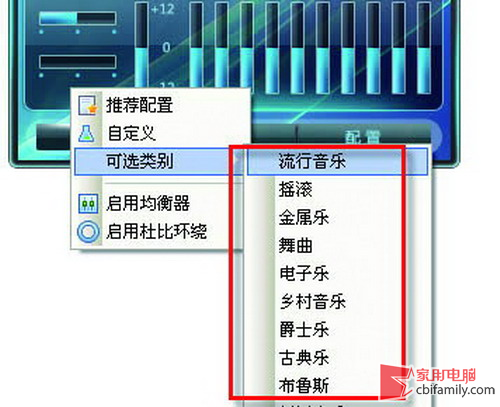 開始均衡器之后,均衡器的值(總體增益值、各個頻段的增益)都是默認(rèn)在零的位置,還起不到太多作用。我們可以選擇“配置”按鈕里面的各種預(yù)設(shè)的均衡值,根據(jù)你當(dāng)前的音樂類型進行選擇。