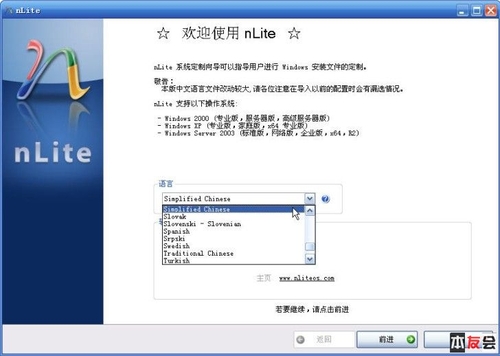 再使用nLite工具前,把XP的ISO文件和SATA驅(qū)動解壓好,然后打開nLite,第一步選擇中文語言