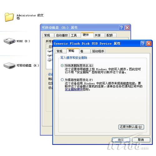這時可以按照自己的需要來選擇: 如果選擇“為快速刪除而優(yōu)化”,這時,使用U盤讀寫的速度會下降,但是當用戶直接拔下U盤時,U盤的數據不會丟失或者損壞;如果選擇“為提高性能而優(yōu)化”,這時,能優(yōu)化U盤的讀寫性能,但是如果直接拔下U盤時,U盤中的數據可能損壞或者丟失。選擇完以后,單擊“確定”即可。