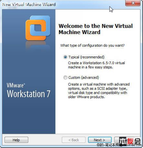 開啟VMware Workstation軟件,從菜單File→New→Virtual Machine...用典型創(chuàng)建(也可用自定義,但沒典型方便,快。)