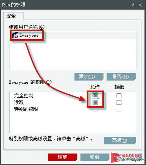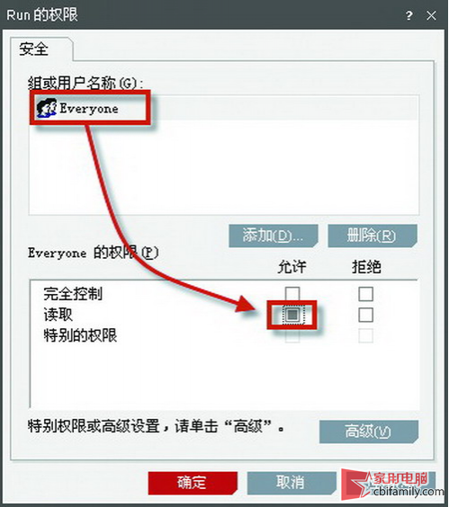 用同樣的方法設(shè)置注冊(cè)表中位于HKEY_LOCAL_MACHINESOFTWAREMicrosoftWindowsCurrentVersionRun處的另一個(gè)“啟動(dòng)項(xiàng)”。設(shè)置完成后,任何病毒都無法再對(duì)“啟動(dòng)項(xiàng)”進(jìn)行修改了。不過病毒無法修改,其他的軟件同樣無法修改,因此當(dāng)我們安裝某些具有自啟動(dòng)功能的軟件時(shí),就會(huì)提示出錯(cuò),這時(shí)只要重新設(shè)置“啟動(dòng)項(xiàng)”的權(quán)限,給“everyone”用戶賦予“完全控制”權(quán)限就可以了。