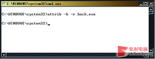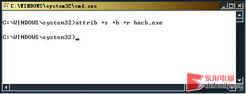 step05為了保護(hù)hack.exe文件夾不被病毒破壞和替換,我們還要給它加上保護(hù)屬性。在“命令提示符”中輸入命令“attrib +s +h +r hack.exe”并回車,其中+s是增加系統(tǒng)屬性,+h是增加隱藏屬性,+r是增加只讀屬性。三種屬性加上以后,hack.exe文件夾就不容易被病毒干掉了。