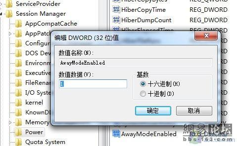 運行注冊表編輯,依次進入HKEY_LOCAL_MACHINE\SYSTEM\CurrentControlSet\Control\SessionManager\Power,然后在右側(cè)窗口空白處單擊鼠標(biāo)右鍵,新建一個“DWORD32位”的值,并命名為“AwayModeEnabled”,雙擊給該鍵值,并賦值為“1”(16進制)。