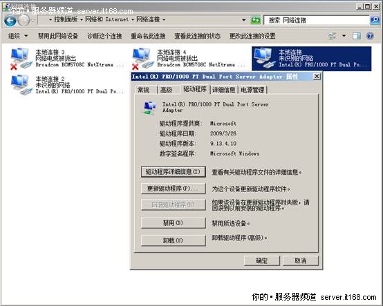 安裝好操作系統(tǒng),Windows Server 2008 R2此時已經(jīng)識別出了兩塊網(wǎng)卡,但Windows自帶驅(qū)動程序只更新到08年12月份。(圖1)