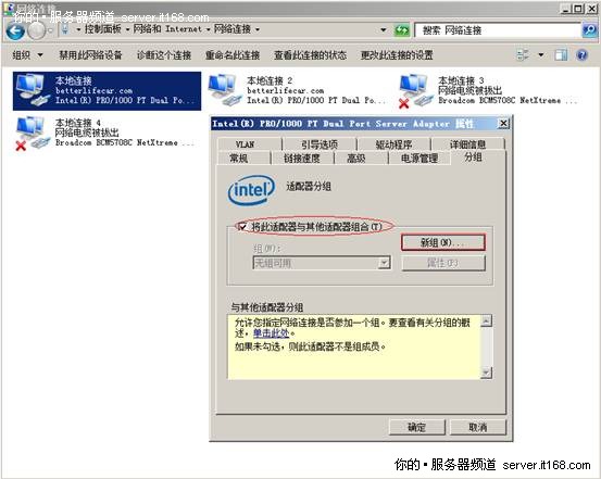 此時點(diǎn)擊【分組】,勾選【將此適配器與其他適配器組合】,并單擊【新組】,來創(chuàng)建一個Teaming(圖9)