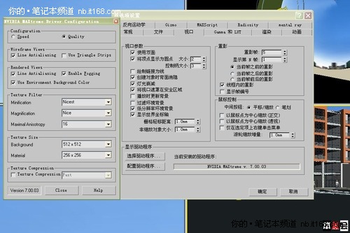 作為對(duì)比,我們來(lái)看更復(fù)雜的模型在專業(yè)顯卡上的表現(xiàn),第一張圖是NV的Quadro FX 4000顯卡的驅(qū)動(dòng)設(shè)置畫(huà)面,可以看到,驅(qū)動(dòng)中內(nèi)置了大量已經(jīng)做好的專門(mén)針對(duì)專業(yè)3D設(shè)計(jì)軟件優(yōu)化的配置,其中包括普通用戶也很熟悉的3Ds Max、AutoCAD、Lightwave、Maye等等。而且,專業(yè)顯卡還能安裝各種專門(mén)的軟件,以圖讓3D設(shè)計(jì)軟件能更好的發(fā)揮顯卡的性能,譬如針對(duì)3Ds Max的是MAXtreme,安裝完畢后,在3Ds MAX中可以選擇MAXtreme作為顯示驅(qū)動(dòng),得到更好的顯示效果、更快的速度。而從第三張圖中可以看到,我將要打開(kāi)的是一個(gè)大小為66.6MB的3Ds MAX模型文件(順便說(shuō)一句,剛才打開(kāi)的那個(gè)建筑模型的文件大小僅僅是600KB而已),請(qǐng)大家在第四張圖中仔細(xì)尋找是否有模型顯示錯(cuò)誤的地方。