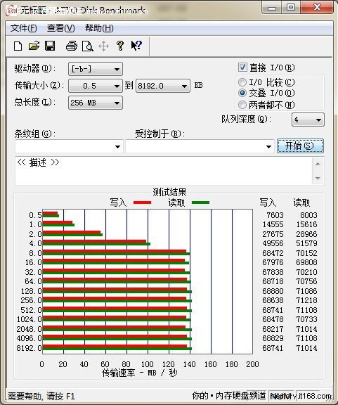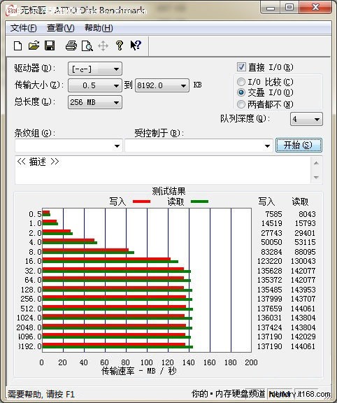 首先對(duì)測(cè)試的主分區(qū)c盤進(jìn)行ATTO讀寫測(cè)試,我們看出最大讀入和寫入速度分別在144MB/S和137MB/S,性能十分強(qiáng)勁。