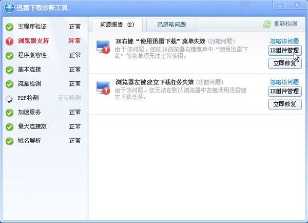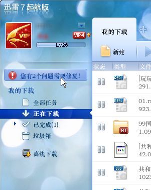 如圖2所示,如果發(fā)現(xiàn)有問題,迅雷會在主界面上給出諸如“您有2個問題需要修復(fù)!”的提示(如圖2),單擊之即可修復(fù)。