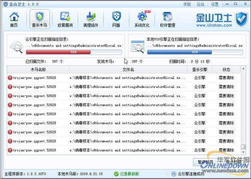 通過金山衛(wèi)士“雙引擎”快速檢測系統(tǒng)中存在的木馬病毒