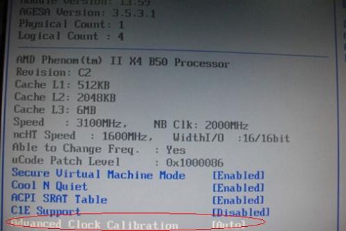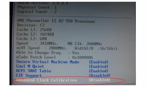 1. 開機(jī)按DEL鍵進(jìn)入主板BIOS設(shè)置,找到Advanced菜單進(jìn)入,再進(jìn)入CPU Configuration子菜單,這時(shí)候我們可以看到AMD Phenom II X2 550處理器的相關(guān)信息,顯示的還是雙核的處理器,在頁面的底部有一個(gè)Advanced Clock Calibration菜單,這個(gè)ACC時(shí)鐘校驗(yàn)是CPU高級(jí)時(shí)鐘準(zhǔn)技術(shù),其作用是提高CPU超頻的幅度和穩(wěn)定性,也是打開處理器被屏蔽核心的關(guān)鍵所在。進(jìn)入Advanced Clock Calibration子菜單,將原默認(rèn)設(shè)置Disabled修改為Auto,這樣就打開了ACC功能。