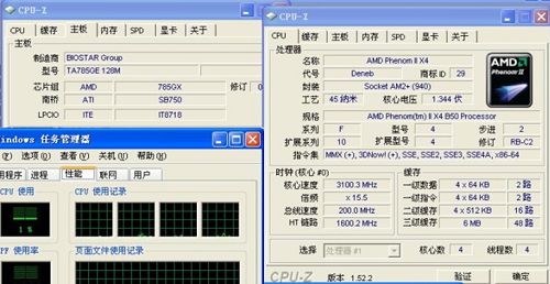 完成以上兩個(gè)步驟操作再打開BIOS,再看CPU基本信息,可以看到原來AMD Phenom II X2 550處理器已經(jīng)變?yōu)锳MD Phenom(tm) II X4 B50四核處理器(如圖07)。進(jìn)入Windows XP操作系統(tǒng),打開最新的CPU-Z1.52.2版,可以看到,CPU名稱已經(jīng)是AMD PhenomII X4,而核心數(shù)也顯示為四核;打開系統(tǒng)任務(wù)管理器,CPU性能也很直觀地顯示四個(gè)線程都在使用中,充分證明開核成功!