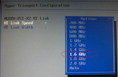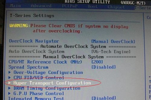 2.HT總線調(diào)整:處理器開核其實(shí)就是把被屏蔽的核心解放出來,由于不同CPU體質(zhì)不一定的差異,為了穩(wěn)定起見,我們需要對(duì)HT總線進(jìn)行相應(yīng)的參數(shù)設(shè)置。在主板BIOS中的T-seris菜單下找到Hyper transport configuration子菜單,把HT Link Speed值直接設(shè)計(jì)為1.6GHz,為在安全和成功率方面考慮,通??刂圃?.2GHz—1.6GHz。按F10保存并退出。