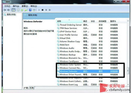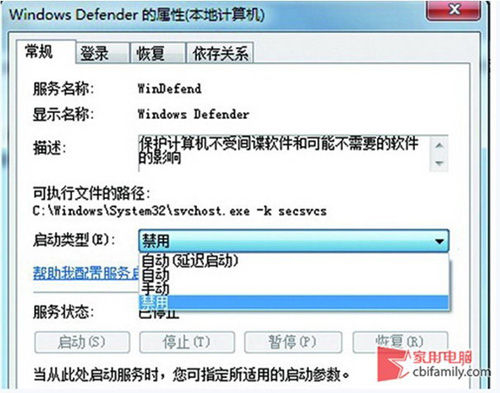 Win7的各種系統服務程序都集中在這里,我們可以選擇對其關閉或者打開。在這里面找到“Windows Defender”,雙擊后會彈出一個對話框,點擊“啟動類型”,在下拉菜單里選擇“禁用”,整個系統服務就被停止了。Windows Search和Volume Shadow Copy的禁用方法與此類似。