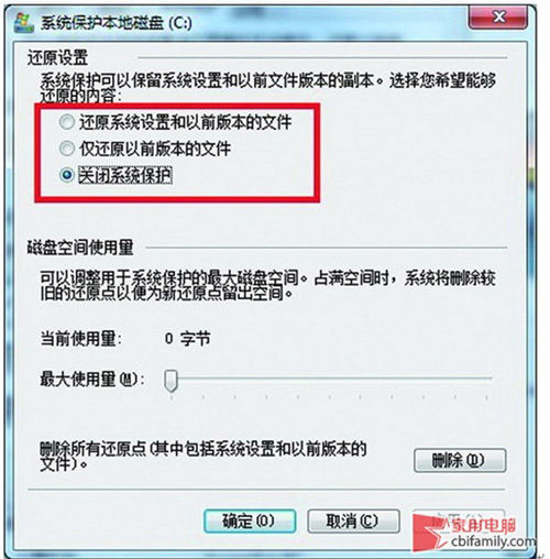 依次點擊“計算機”“屬性”“系統保護”,選擇“配置”,在隨后的界面中選擇“關閉系統保護”。這里所謂的系統保護實際上就是Win7的自動備份功能,如果你不需要經常還原系統,完全可以關閉。