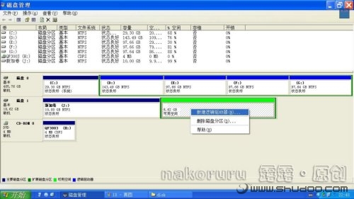 接下來,才是針對每個邏輯驅(qū)動器進(jìn)行劃分操作。這時候,操作已經(jīng)很熟練了吧?在“可用空間”上點(diǎn)鼠標(biāo)右鍵,選擇“新建邏輯驅(qū)動器”: