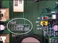 CMOS跳線大都在主板電池附近。它的設置比較簡單,只有兩種方式:NORMAL和CLEAR CMOS(一般在CMOS跳線附近會有跳線的說明)。當設置為1-2(短接)時,為正常狀態(tài);當設置為2-3(短接)時,為清除CMOS設置,可以用來清除CMOS密碼、開機密碼等(如圖6)。