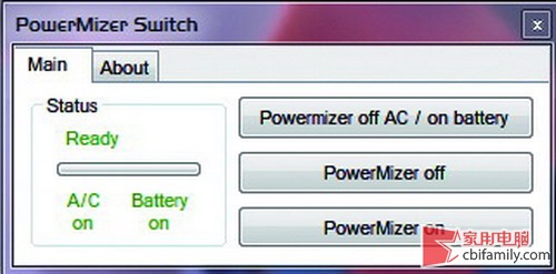 執(zhí)行補(bǔ)丁程序后,切換到“Main”界面,然后根據(jù)需要開啟顯卡自動(dòng)降頻功能。例如電池供電時(shí),單擊最上方按鈕,將其設(shè)為“Powermizer off AC/on battery”狀態(tài),單擊“Powermizer on”按鈕后(如圖3),這樣GPU會(huì)根據(jù)功耗自動(dòng)調(diào)節(jié)頻率。