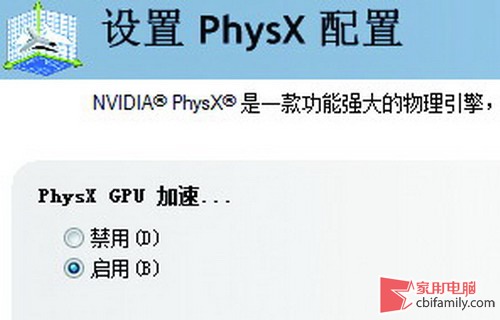 再次重新啟動(dòng)系統(tǒng),進(jìn)入“控制面板”,打開NVIDIA PhysX圖標(biāo),接著進(jìn)入“NVIDIA配置”界面,勾尋PhysX GPU加速”下面的“啟用”復(fù)選框(如圖2),單擊“應(yīng)用”按鈕。
