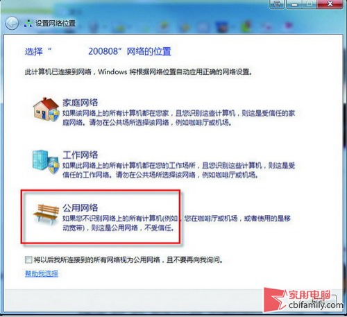 當接入新的網(wǎng)絡的時候,Windows 7/Vista會提示設置新網(wǎng)絡。在家里可以選擇“家庭網(wǎng)絡”,在外面上網(wǎng)或者擔心同網(wǎng)絡的“怪叔叔”攻擊的,請一定選擇“公用網(wǎng)絡”,這樣在Windows7的默認安全設置下面,能提高一定的安全性。