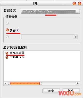 3.打開(kāi)屬性窗口,在混音器里 選擇 Input 選項(xiàng),并選擇 錄音,確保下面的白色方框的 麥克風(fēng)音量 選中,按確定。