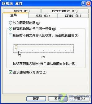 我們不妨想一想,用一個(gè)簡(jiǎn)單的辦法來解決這個(gè)問題:首先用鼠標(biāo)右鍵單擊“回收站”圖標(biāo),從快捷菜單中選擇“屬性”命令,打開“回收站屬性”對(duì)話框,選擇“全局”選項(xiàng)卡,把“回收站的最大空間”設(shè)為0%,設(shè)置(如圖2)所示。確定后,再試試刪除剛才刪不了的文件,一般就可以了。