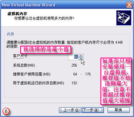 6、分配虛擬機(jī)內(nèi)存:注意輸入的數(shù)值必須是4MB的整倍數(shù)。