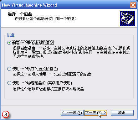 8、選擇一個(gè)磁盤(pán):初次安裝使用VMware Workstation還是選第一項(xiàng)的吧,第二項(xiàng)的意思是當(dāng)你安裝第二個(gè)(或更多)虛擬機(jī)時(shí)讓這些虛擬機(jī)公用一個(gè)已建立好的磁盤(pán)空間,如果你的硬盤(pán)夠大,還是推薦你建立另外一個(gè)虛擬機(jī)時(shí)仍然選擇第一個(gè)選項(xiàng),不過(guò)千萬(wàn)不要選擇第三項(xiàng),因?yàn)檫x擇此項(xiàng)后操作虛擬機(jī)時(shí)將會(huì)對(duì)物理機(jī)磁盤(pán)進(jìn)行真實(shí)的讀寫(xiě),萬(wàn)一弄丟掉主機(jī)上保存的資料,這種滋味會(huì)很不好受的哦~,所以沒(méi)有十足把握和必要還是安穩(wěn)一點(diǎn)吧^_^。
