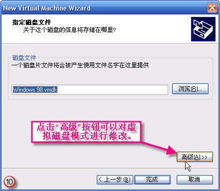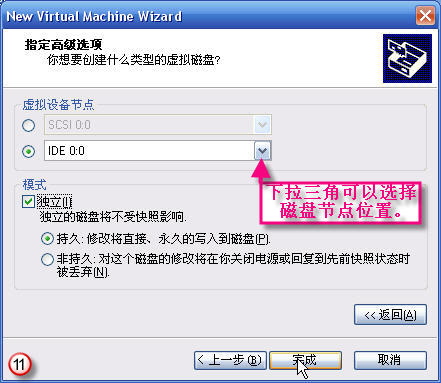 11、進(jìn)入“磁盤(pán)高級(jí)選項(xiàng)”:選擇SCSI磁盤(pán)類(lèi)型可以最大限度發(fā)揮出虛擬磁盤(pán)性能,這里我選擇的是默認(rèn)的IDE磁盤(pán)類(lèi)型。在模式選項(xiàng)中,“獨(dú)立-持久”磁盤(pán)模式不支持快照,并且對(duì)虛擬機(jī)的操作修改會(huì)將數(shù)據(jù)直接、永久的寫(xiě)入磁盤(pán),反之“非持久”磁盤(pán)模式你也能想像到了……這里我依然保持默認(rèn)的選項(xiàng)。