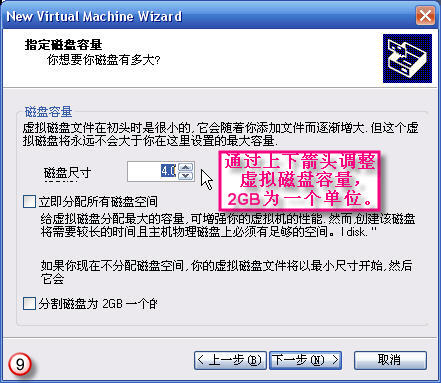 9、指定虛擬磁盤(pán)容量:建議不要勾選復(fù)選框,這樣創(chuàng)建的虛擬磁盤(pán)將會(huì)如圖中描述的那樣大小隨著對(duì)虛擬磁盤(pán)安裝操作系統(tǒng)和應(yīng)用軟件的多少而增加。大小可以保持默認(rèn)的4GB,這對(duì)安裝常用的操作系統(tǒng)和應(yīng)用軟件來(lái)說(shuō)已經(jīng)足夠了。