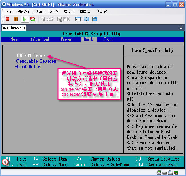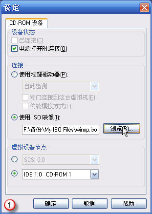 (2)雙擊虛擬硬件設(shè)備CD-ROM1,選擇“使用ISO映象”按目標(biāo)路徑鍵入WIN98.ISO,然后可以開(kāi)機(jī)了。