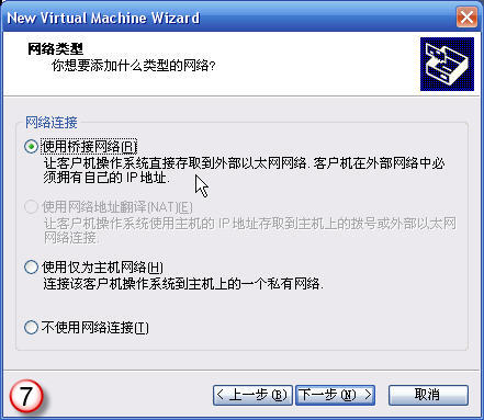 7、添加網(wǎng)絡(luò)類(lèi)型:對(duì)于圖中出現(xiàn)的可供選擇的網(wǎng)絡(luò)類(lèi)型VMware Workstation幫助文件中是這樣定義的: