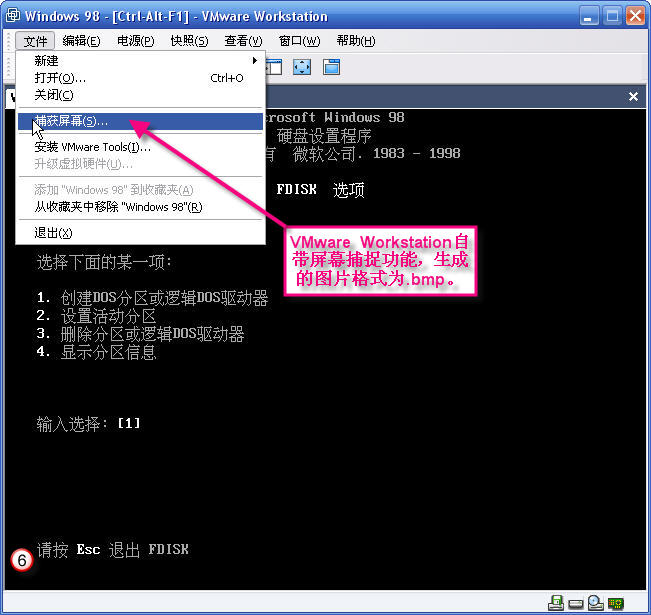 (6)這里我用安裝盤(pán)自帶的中文FDISK來(lái)分區(qū),4G的虛擬硬盤(pán)我分2個(gè)區(qū)(為了方便也可只分一個(gè)區(qū))。