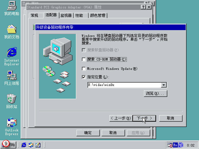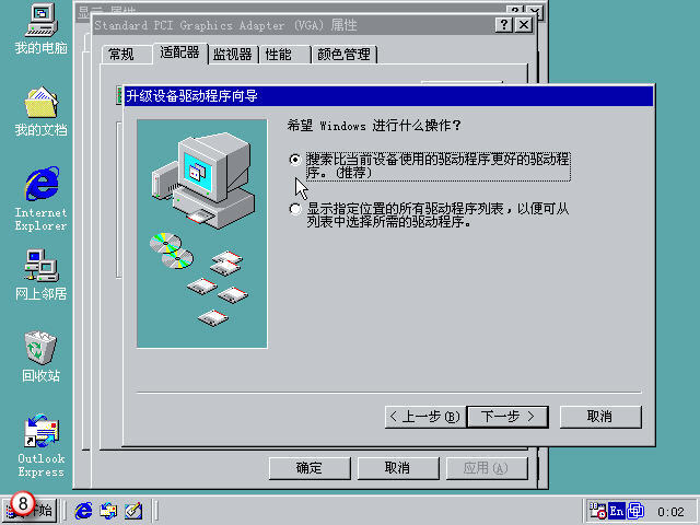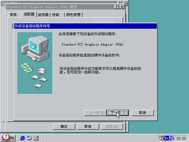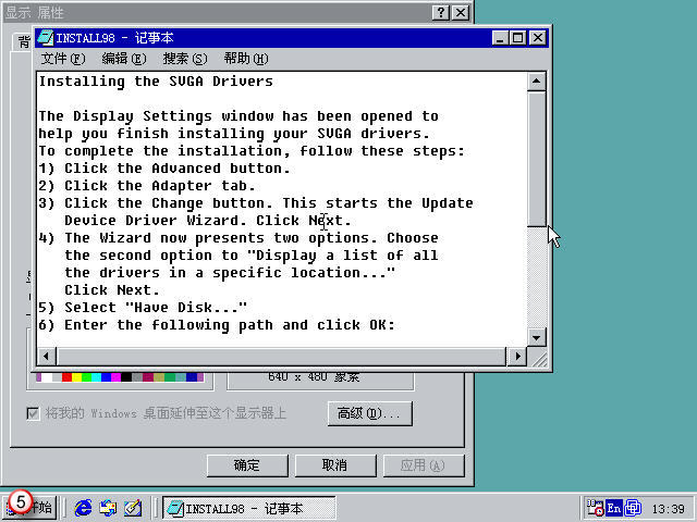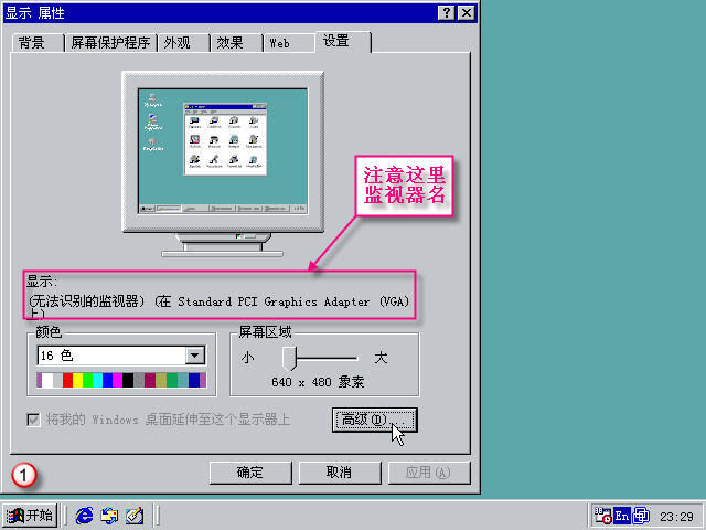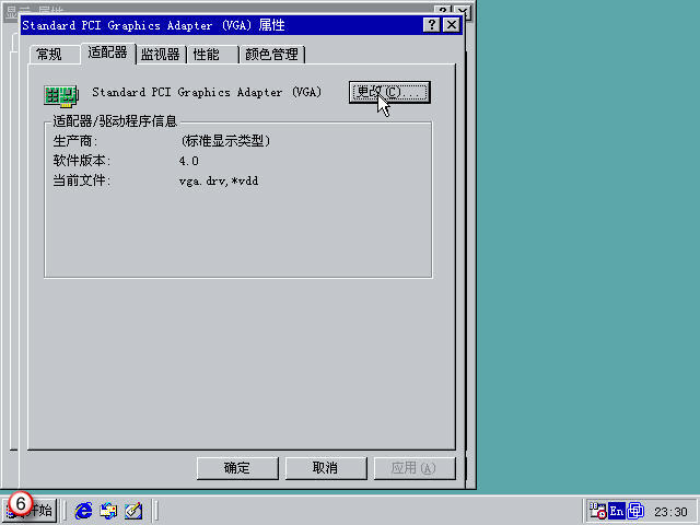 6、按照說(shuō)明在虛擬98下操作:顯示-屬性-高級(jí)適配器,單擊“更改”。