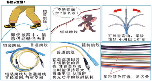 該產(chǎn)品與傳統(tǒng)光纖跳線的最大區(qū)別在于它針對光纖易折斷、易被損壞的缺點,特別設(shè)計生產(chǎn)一種細小的可撓性不銹鋼套管來保護光纖,再在套管外加上阻燃PVC被覆,以達到放潮防火等功能。同時,開發(fā)出了特別的制造工藝和獨特的結(jié)構(gòu)來保證套管與接頭牢固連接。這樣獨特的設(shè)計,使鎧裝光纖跳接線的施工布線變得簡潔方便,降低施工過程中的損耗,并可提高光纖跳接線的使用壽命,提高整個系統(tǒng)的安全和穩(wěn)定性。