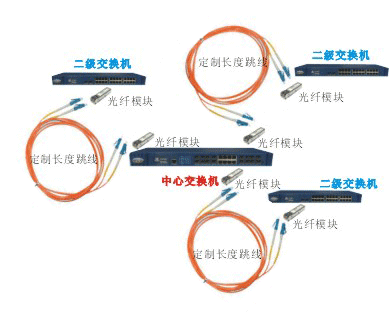 二級交換機:光纖的另一頭接到各二級交換機所在處,首先接入到光纖終端盒中,經(jīng)固定后可直接與光纖跳線熔接,通過光纖跳線連到二級交換機的光纖模塊上?;蛘吖毯笙扰c光纖尾纖熔接,然后通過光纖尾纖連到光纖藕合器上,再通過光纖跳線從光纖藕合器連到二級交換機的光纖模塊上。