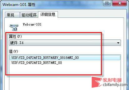 在打開(kāi)的窗口中,定位到“詳細(xì)信息”選項(xiàng)卡,通過(guò)下拉菜單找到“硬件ID”,然后就可以在下方窗格中看到諸如USBVID_174F&PID_1120&MI_00這樣的字段。記下這段字符,然后再回到第二步打開(kāi)的網(wǎng)頁(yè)上面。