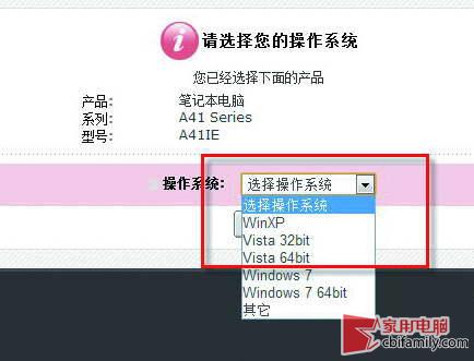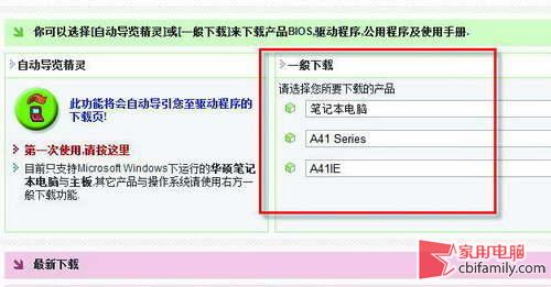 在瀏覽器中打開(kāi)華碩筆記本的官方網(wǎng)站,http://www.asus.com.cn/并進(jìn)入服務(wù)與支持中的下載專(zhuān)區(qū),然后在下載專(zhuān)區(qū)通過(guò)3個(gè)下拉菜單找到相應(yīng)的筆記本型號(hào)。例如選擇筆記本電腦→A41 Series→華碩A41 E。