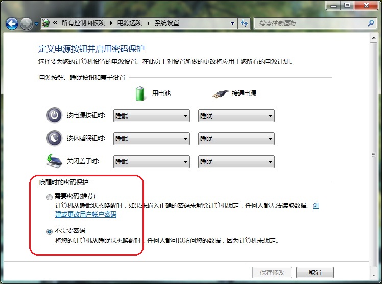 解決方案:在控制面板\\電源選項(xiàng)\\喚醒時(shí)需要密碼\\不需要密碼,如下圖: