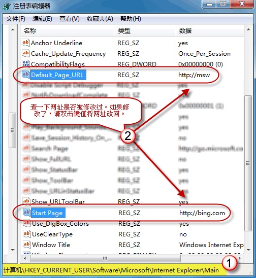 類似地,請(qǐng)依次定位到以下3個(gè)注冊(cè)表項(xiàng)。單擊Main,查看右邊細(xì)節(jié)窗口中[Default_Page_URL]值和[Start Page]值是否有異常。如果被修改了,請(qǐng)根據(jù)自己的需要改回(右擊鍵值,選擇“修改”進(jìn)行更改)。