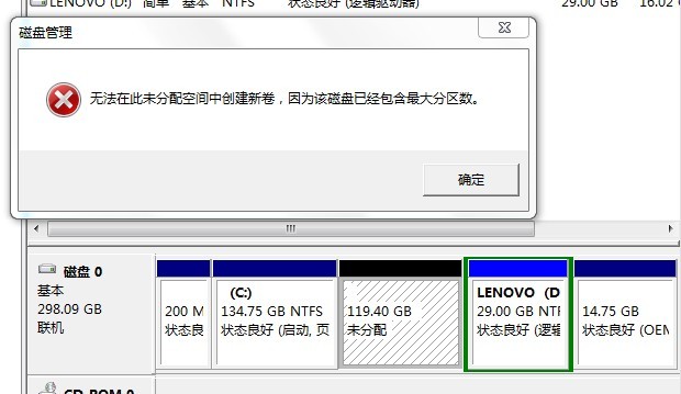 WIN7系統(tǒng),在系統(tǒng)下創(chuàng)建分區(qū)的時候提示“無法在此分配空間中創(chuàng)建新建卷,因為該磁盤已經包含最大分區(qū)數”。請問如何處理?