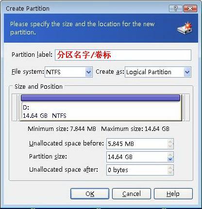 點創(chuàng)建分區(qū)按鈕以后會彈出創(chuàng)建分區(qū)選項界面,這里可以設置分區(qū)的卷標(Partition Label),分區(qū)的文件系統(tǒng)(File System),分區(qū)類型(Create as)(主分區(qū)/邏輯分區(qū)),此分區(qū)前部剩余空間(Unallocated Space Before),分區(qū)大小(Partition Size),此分區(qū)后部剩余空間(Unallocated Space After)。