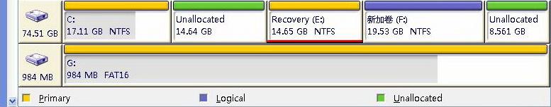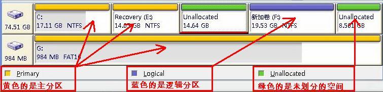 如下圖所示,黃色的是主分區(qū),藍色的是邏輯分區(qū),綠色的是未劃分的空間