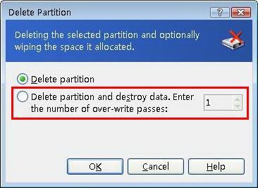 點刪除按鈕以后會彈出刪除分區(qū)的確認框,這里有個貼心的設計就是有徹底摧毀數(shù)據(jù)的功能,可以手動設置覆蓋數(shù)據(jù)(Over-Write)的次數(shù)來達到保護數(shù)據(jù)不外流的目的。