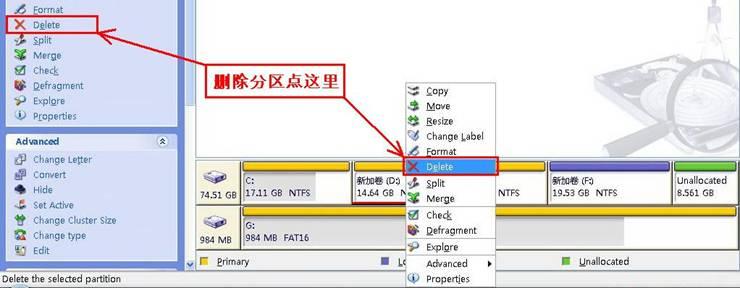 在需要刪除的分區(qū)上點右鍵,再點刪除(Delete),或者選中分區(qū)后直接點左邊任務欄中的刪除按鈕。