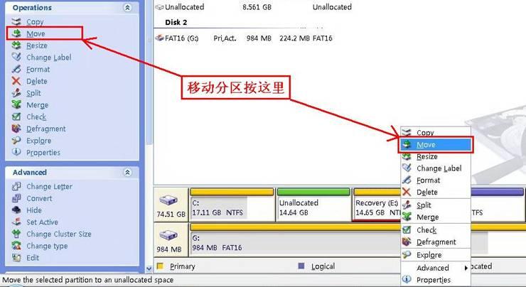 在要移動的分區(qū)上點右鍵(這里以恢復盤Recovery E盤做示范)選擇移動(Move),或者是選中分區(qū)后點左邊任務欄中的移動按鈕。